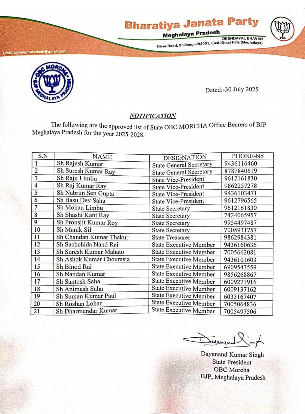 भारतीय जनता पार्टी ( भाजपा ) की मेघालय इकाई ने वर्ष 2025-2028 के लिए राज्य ओबीसी मोर्चा पदाधिकारियों की अनुमोदित सूची जारी की है। ओबीसी मोर्चे के प्रदेश अध्यक्ष दयानंद कुमार सिंह द्वारा हस्ताक्षरित अनुमोदित सूची को जारी किया गया।